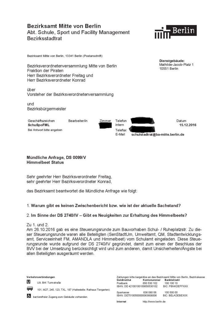 Zwischenbericht: Antwort Bezirksstadtrat Carsten Spallek zur Anfrage der PIRATEN-Partei
